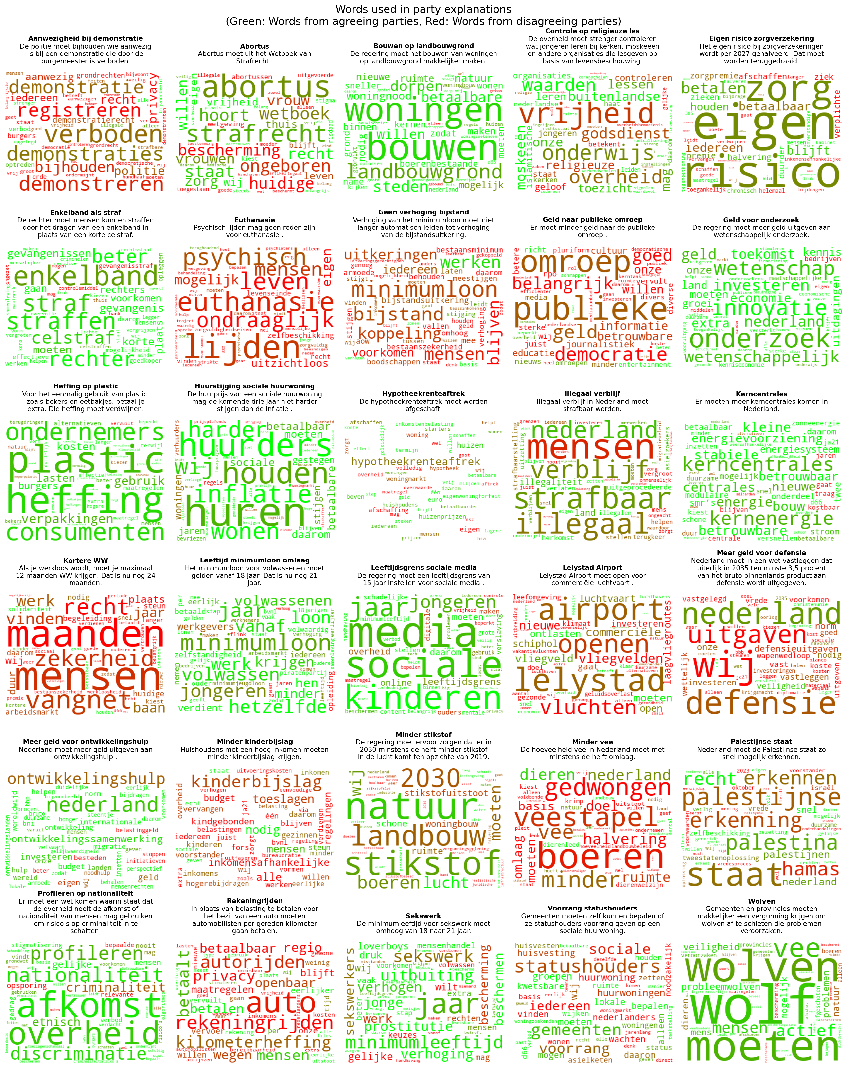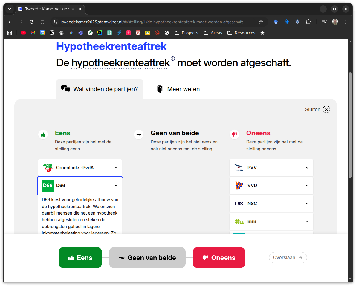 - Each party’s stance: Eens (agree), Oneens (disagree), Geen van beide (neutral)