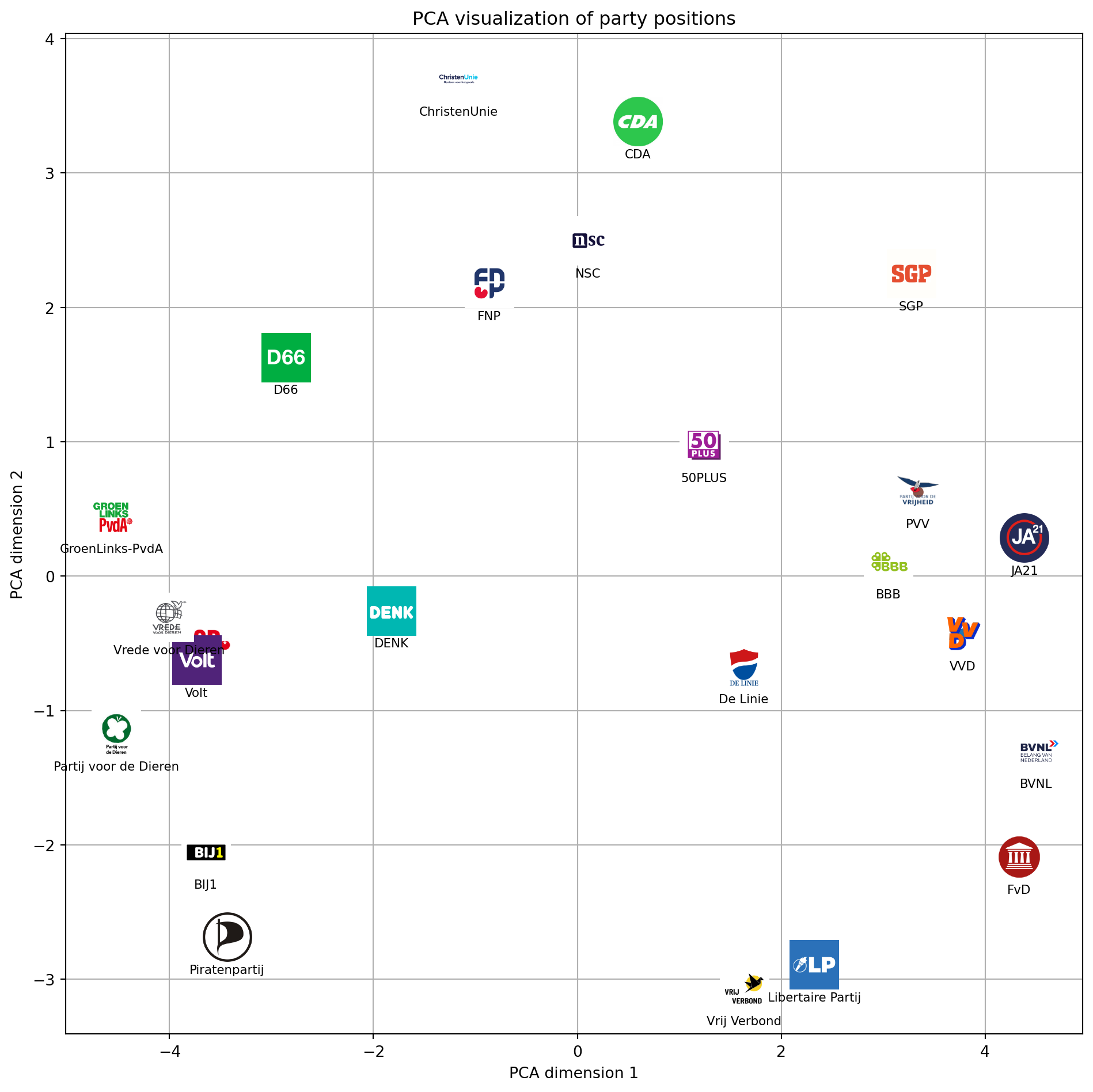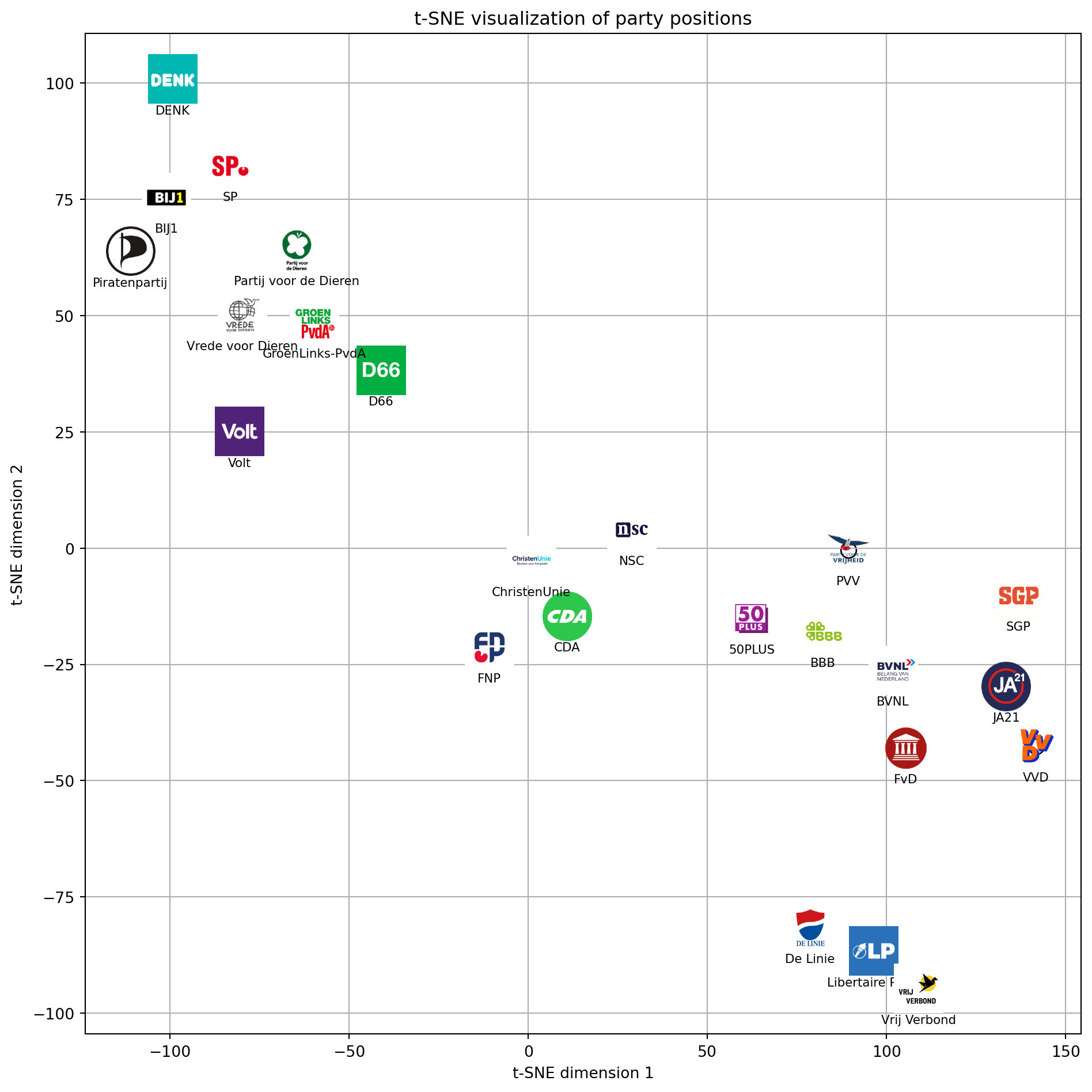Still, even with tools like this, voting often feels like picking the least bad option. That frustration got me wondering: how different are these parties, really? And in what way? To explore that, I scraped the positions of the various parties on those statements to do some data exploration. I’ll visualize parties in 2D using t-SNE to see if any clusters arise. I’ll also perform a PCA and try to interpret the first two principal components and map them to underlying ideologies.