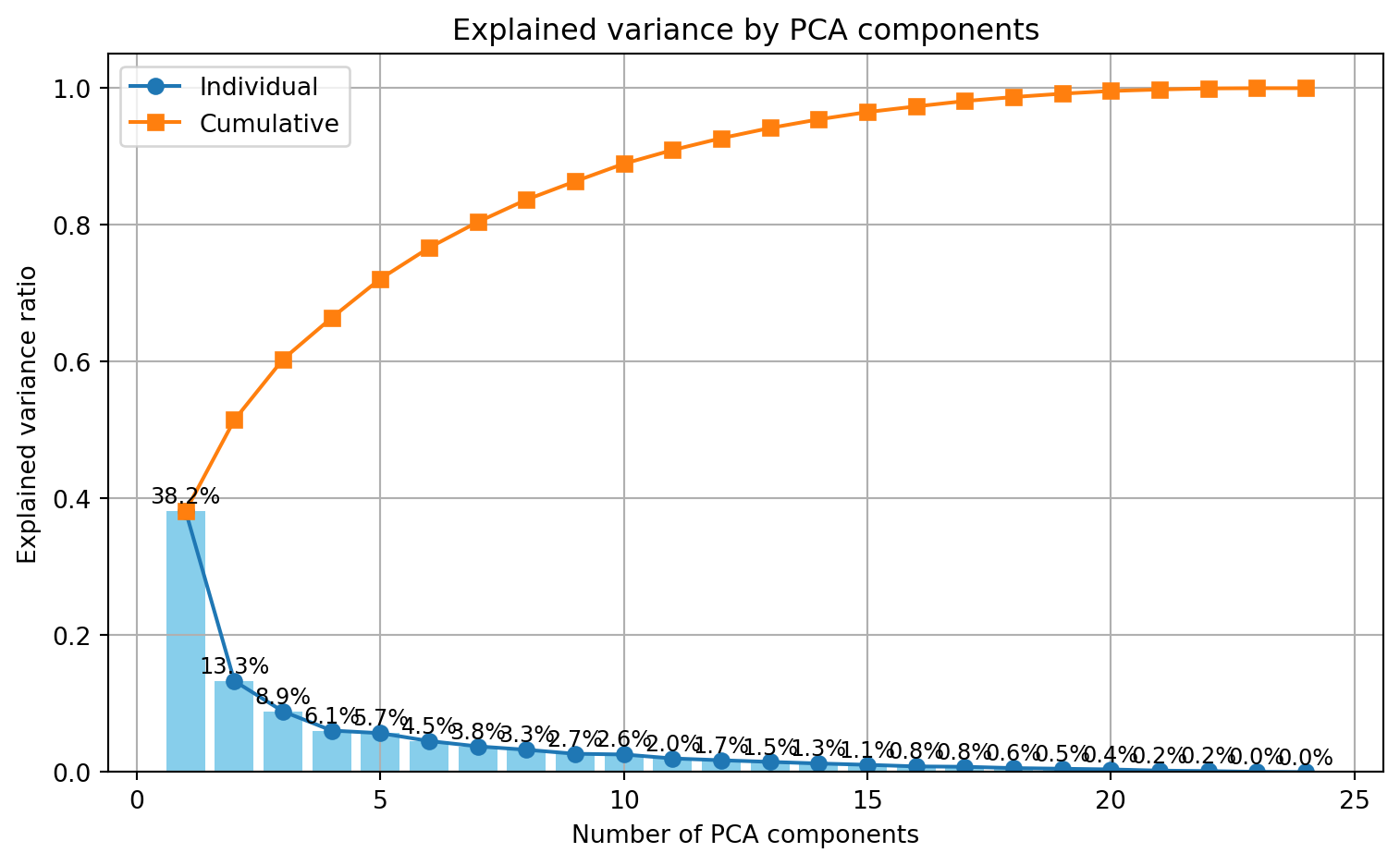 Most variance is captured by PC1 (38.2%). Explanatory power then drops quickly, but PC2 still captures 13.3% of the variance.
